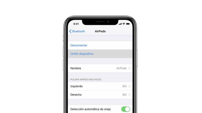 3.- Si siguen sin poder enlazarse intenta lo siguiente, ve a Ajustes > Bluetooth y pulsa el icono “i” que aparece junto a los AirPods.2. A continuación, pulsa Omitir dispositivo y vuelve a pulsar para confirmar.